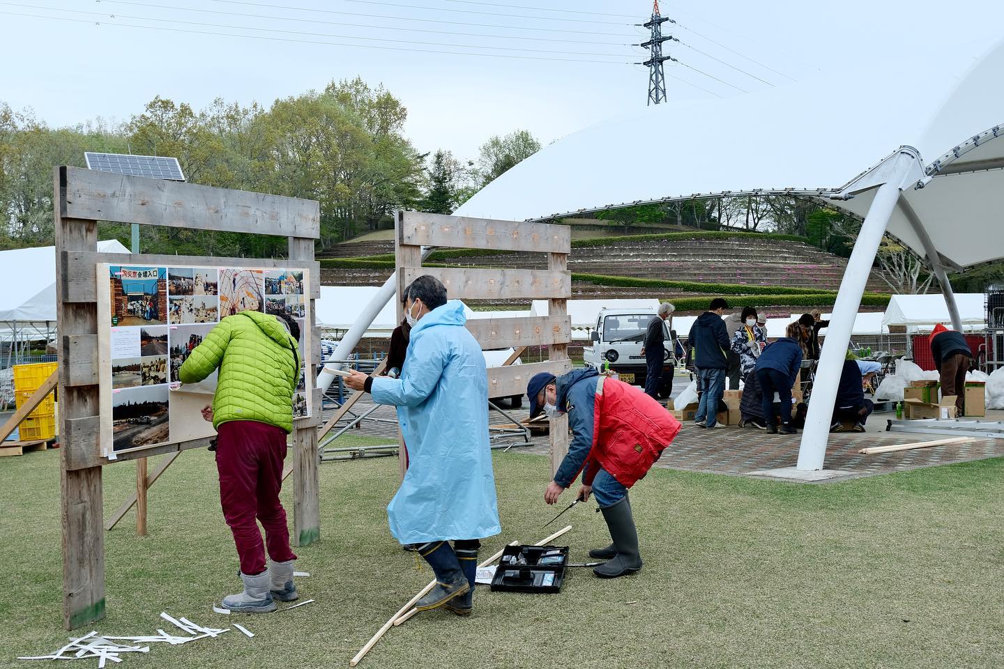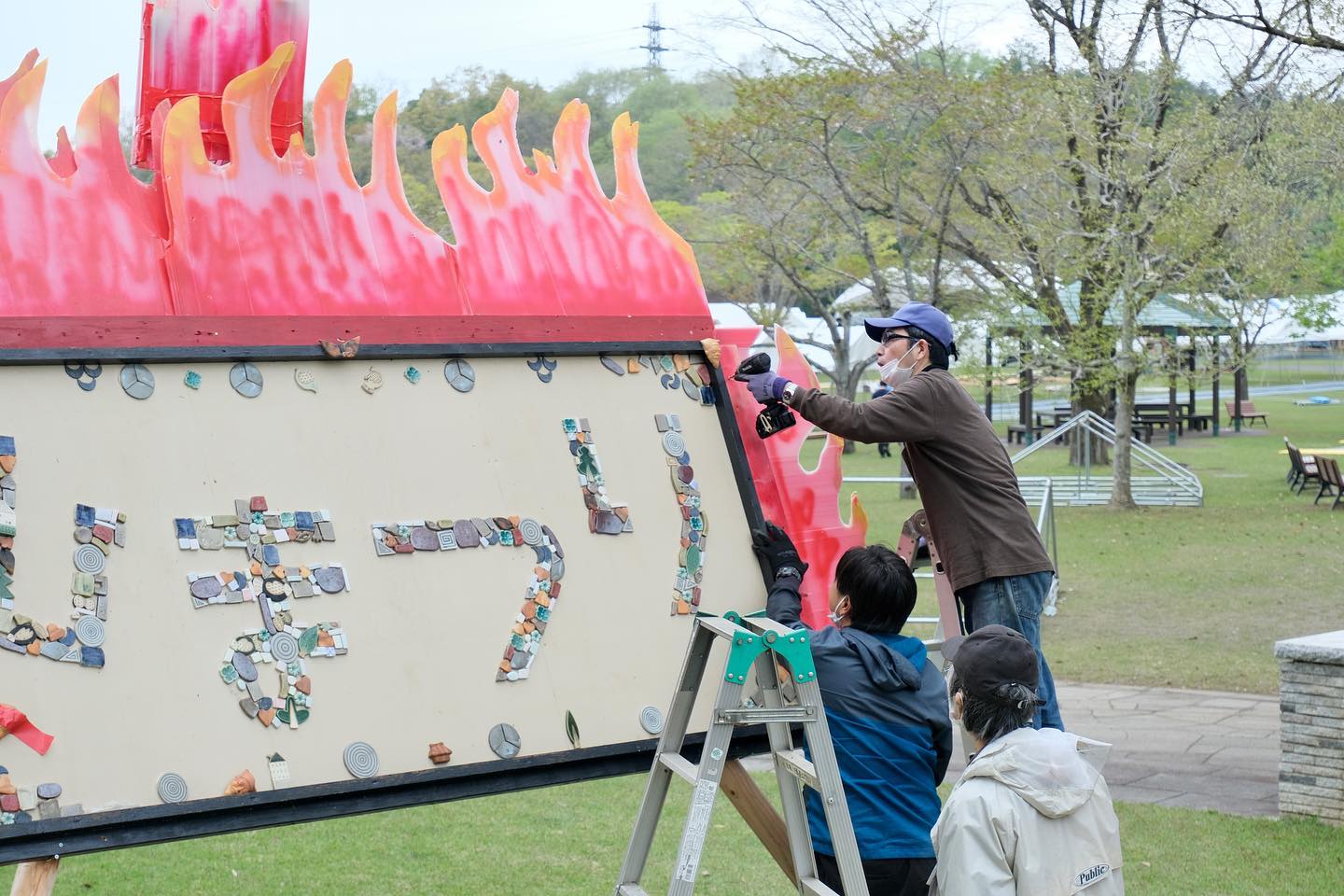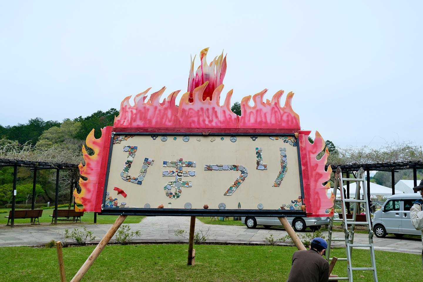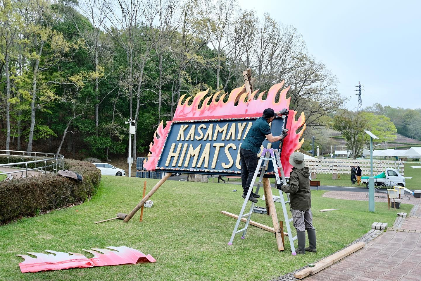 2022.04.21 お知らせ ,陶炎祭ができるまで(各委員会のお仕事の様子) 会場作り作業風景 陶炎祭まであと一週間、会場作りも着々と進んでいます。昨日の全体作業後にはゲートや案内板など、それぞれの委員会による作業も行われました。 笠間の陶炎祭(ひまつり)は、茨城県内の陶芸家の皆の力を合わせて作り上げているお祭りです。お越しになられた際には、手作りの会場の雰囲気も楽しんでいただけたらと思います!